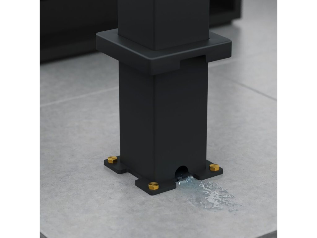 Robustní sloupek má rozměry 116x116 mm, při instalaci je zapotřebí počítat s patkou sloupku o rozměrech 160x160 mm. Patka je z 8 mm silné oceli a je navíc zakryta hliníkovým krytem (165x165 mm) s integrovaným drenážním systémem. Vyvýšený hliníkový profil s přidanou horní lištou ukrývá lamely tak, že z bočního pohledu nejsou viditelné a jsou v jedné linii s profilem.