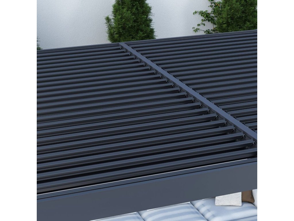 Velmi pevná a stabilní konstrukce v antracitové barvě RAL 7016, v matné povrchové úpravě se hodí do každého prostoru. Pergola je vyrobena z vysoce kvalitního hliníku, který je ošetřen práškovou barvou, což zaručuje odolnost vůči povětrnostním vlivům.