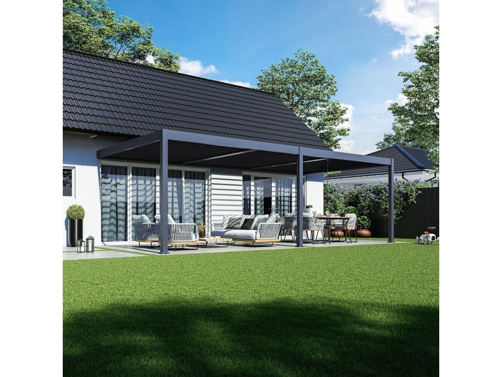 Prémiová zahradní hliníková bioklimatická pergola instalovaná do stěny, o rozměrech 8x4 metry představuje ideální způsob zastřešení Vašeho venkovního posezení.