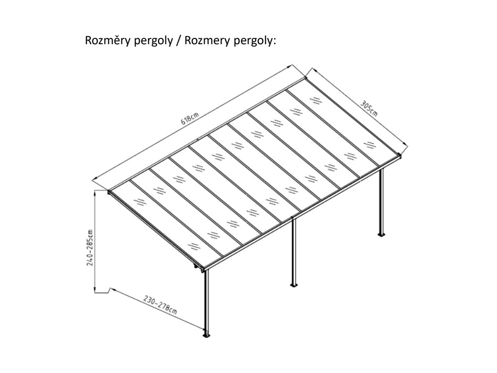 Velká zahradní hliníková pergola s polykarbonátem o velikosti 618x305cm.