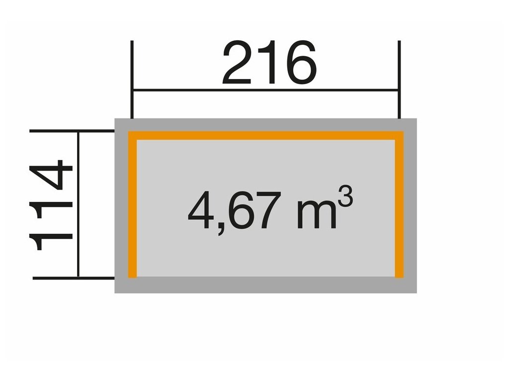 Vnitřní rozměry jsou 216 x 114 cm a celkový objem je 4,67 m³.