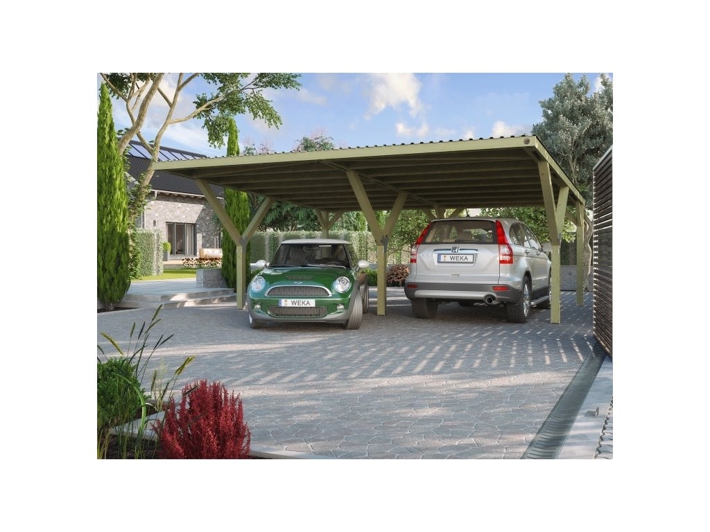 Dvojitý přístřešek na auto WEKA Y 612 je ideální možnost, jak vyřešit parkování v menších prostorách na vaší zahradě.