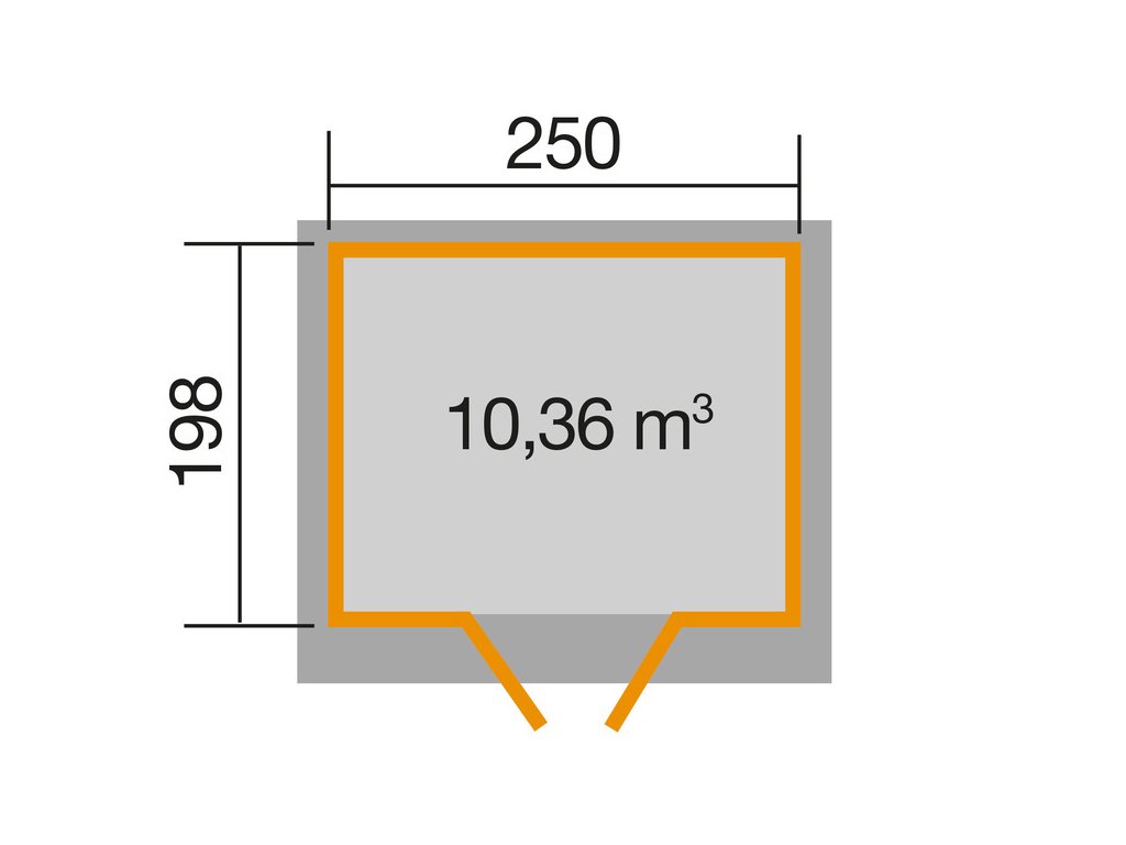 Základna domku (bez přesahu střechy) je 250 x 198 cm, síle stěny 19 mm, podlaha z masivního dřeva o tloušťce 15,5 mm a střecha z masivního dřeva o tloušťce 16 mm zajišťují optimální stabilitu a nabízí dostatek prostoru pro organizaci.