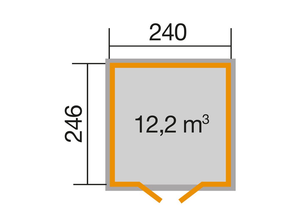 Základna domku (bez přesahu střechy) je 240 x 246 cm, podlaha z masivního dřeva o tloušťce 18,5 mm a sedlová střecha z masivního dřeva o tloušťce 19 mm zajišťují domku potřebnou stabilitu.