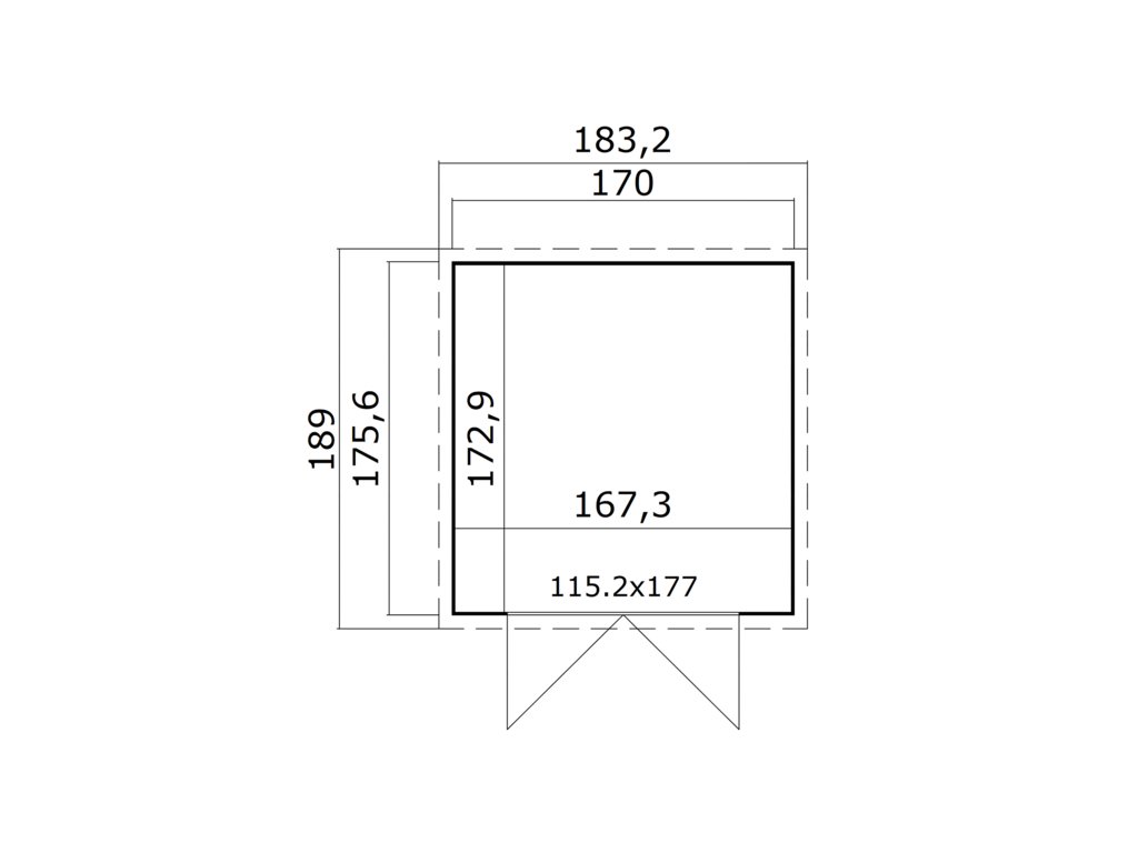 Základna domku (bez přesahu střechy) je 170 x 175,6 cm, jedná se o domek s menší tloušťkou stěny 13 mm a 15 mm šikmou střechou.