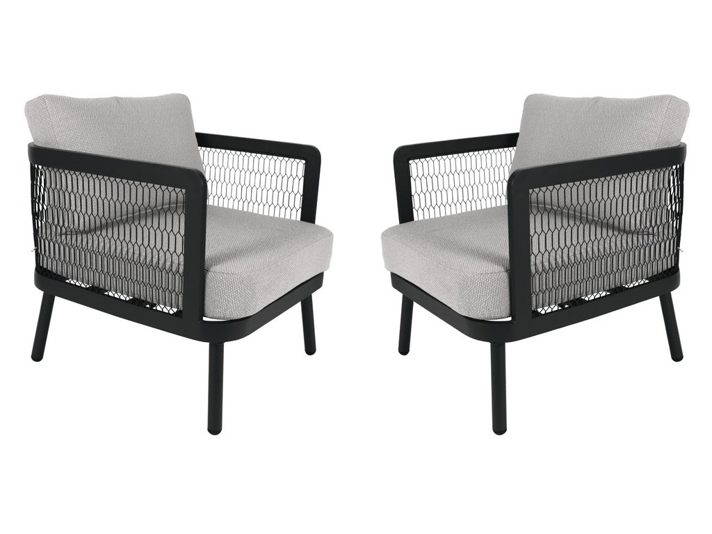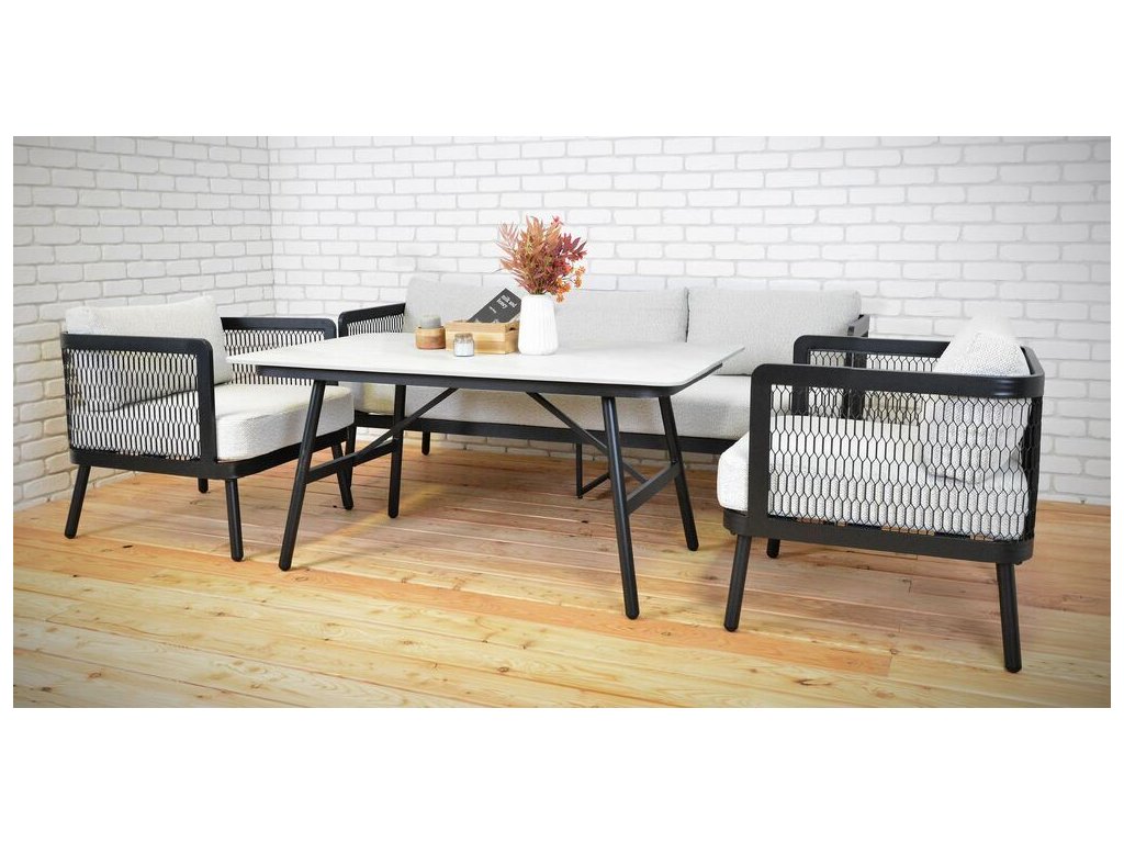 Luxusní hliníková souprava v černém provedení, doplněna o stolovou desku z hliníku a pryskyřice v dezénu kamene. Moderní souprava, která skvěle zapadne do každého exteriéru či interiéru.