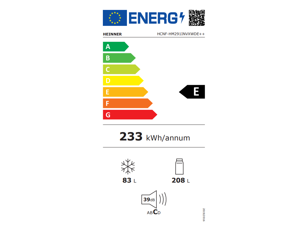 Kapacita 291 l (204 l chladnička / 87 l mrazák). Energetická třída E, roční spotřeba 232 kWh. Funkce zahrnují dávkovač vody, LED displej a tichý provoz 40 dB. Rozměry: 185,8 x 60 x 60,5 cm.
