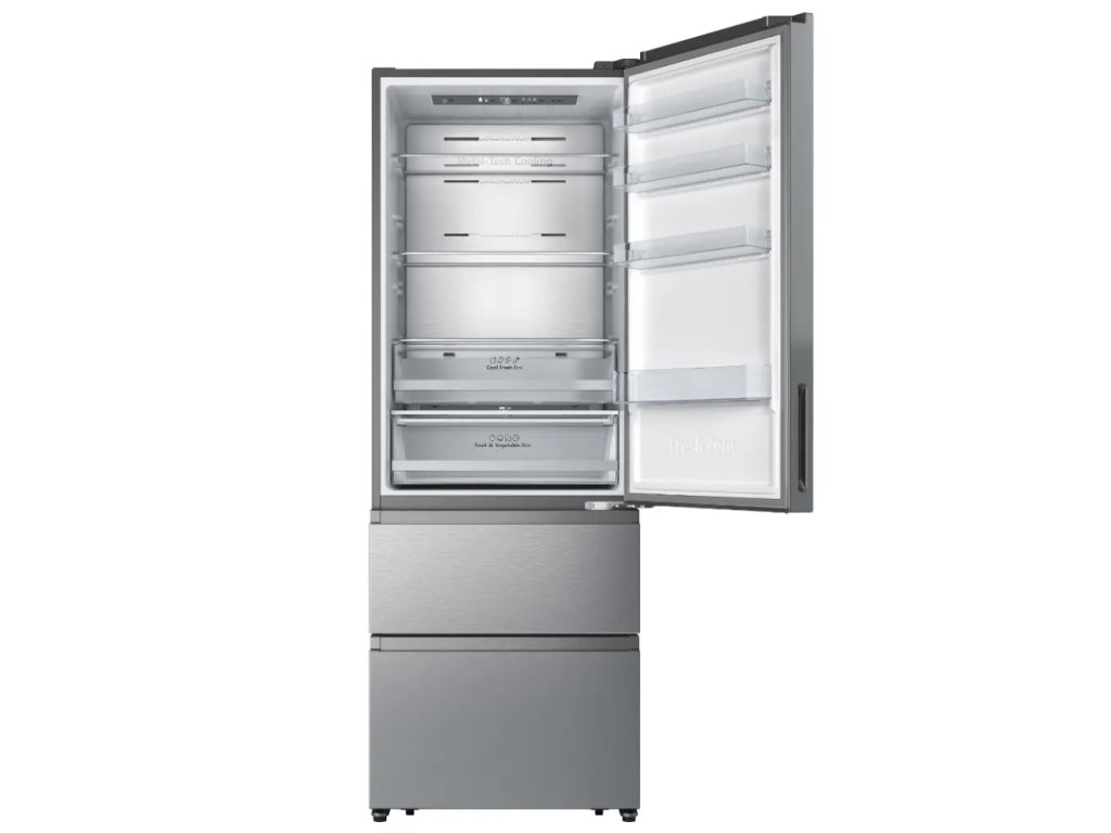 Chladicí oddíl s čistým objemem 344 litrů u chladničky Hisense RT641N4AID nabízí 4 police z tvrzeného skla, 2 nastavitelné police a 4 police ve dveřích. Získáte tak neobyčejně velkorysý úložný prostor vhodný pro uchování velkého množství potravin, aniž by byl přecpaný. Zadní stěna Metal-Tech Cooling je pokryta nerezovou ocelí, která zajišťuje rovnoměrné rozptýlení chladného vzduchu. Inteligentní systém Multi Air Flow pomocí rozšířeného proudění chladného vzduchu zajišťuje, aby vaše uskladněné potraviny zůstaly co nejdéle svěží, plné chuti a vitamínů. Zóna Fresh Crisper udrží vaše ovoce a zeleninu čerstvé po delší dobu.