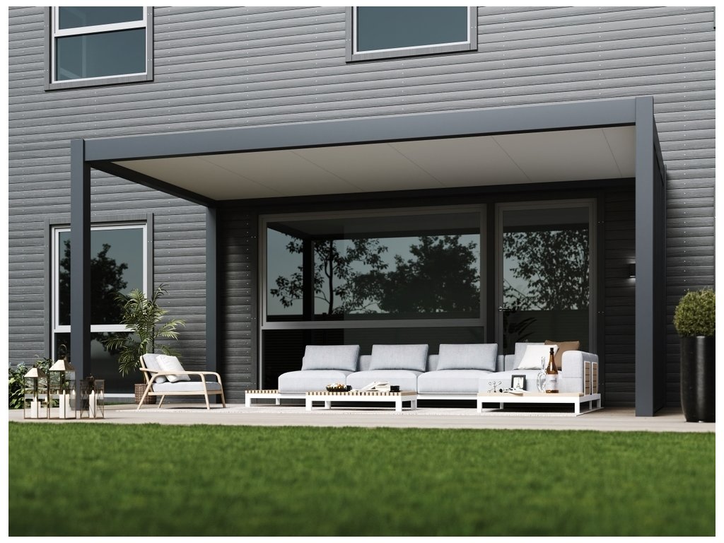 Střecha je z oceli a z pevných sendvičových panelů z PU pěny. Tyto 8 cm silné panely mají skvělé uživatelské vlastnosti. Díky nim má střecha nosnost až 100 kg/m2. Při velké vrstvě sněhu doporučujeme sníh ze střechy průběžně odstraňovat. Z vrchní strany jsou panely v antracitovém provedení, takže ladí se zbytkem konstrukce. Ze spodní částí je naopak bílá barva, aby pod samotným přístřešek bylo maximum světla.