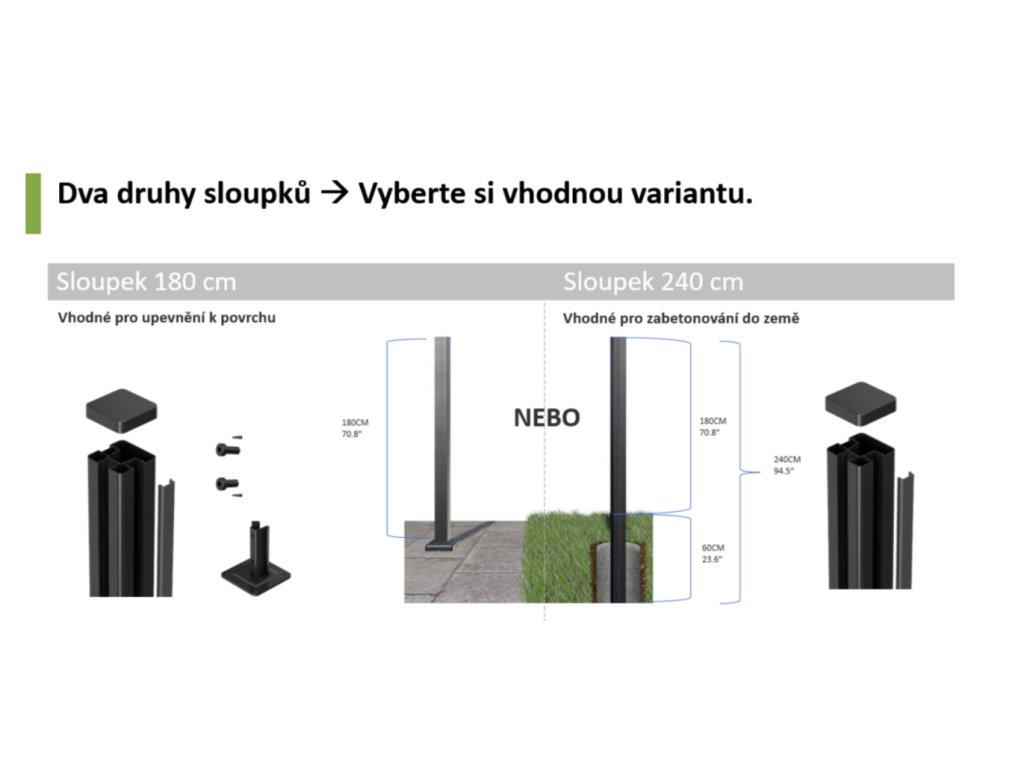 - Zvolte vyhovující typ sloupků - přišroubování do povrchu nebo betonování do země