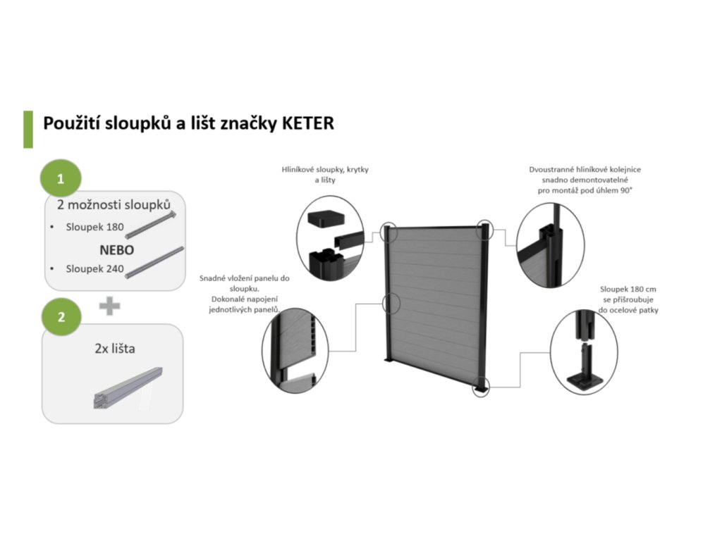 Sloupek je plně kompatibilní s plotovými panely KETER, což umožňuje snadnou tvorbu dlouhých plotových linií i rohových dílů. Dvoustranné hliníkové kolejnice lze jednoduše demontovat pro montáž pod úhlem 90°. Stavebnicový systém umožňuje rychlé sestavení i pro laiky.