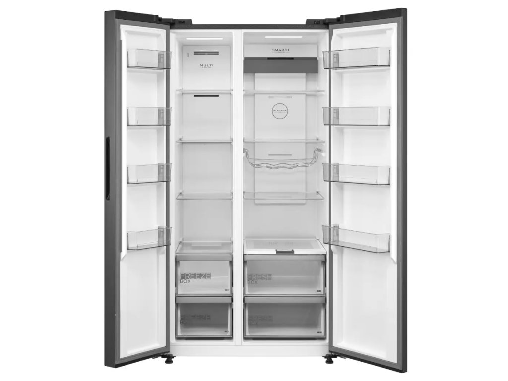 Americká volně stojící chladnička Midea MDRS791MIC46 je skvělým řešením pro ty, kteří potřebují uskladnit velké množství potravin. Nadstandardní objem chladničky nabízí 379 l, objem mrazničky je 213 l. Pyšní se trojrozměrným oběhem vzduchu Multi Air Flow, který zajišťuje rovnoměrné a účinné chlazení potravin. Lednice využívá k provozu šetrné chladivo R600a. LED osvětlení vám celý prostor chladničky rovnoměrně a jasně osvítí, abyste měli naprostý přehled. Ušetříte i za spotřebu energie, protože tento typ osvětlení se nezahřívá.