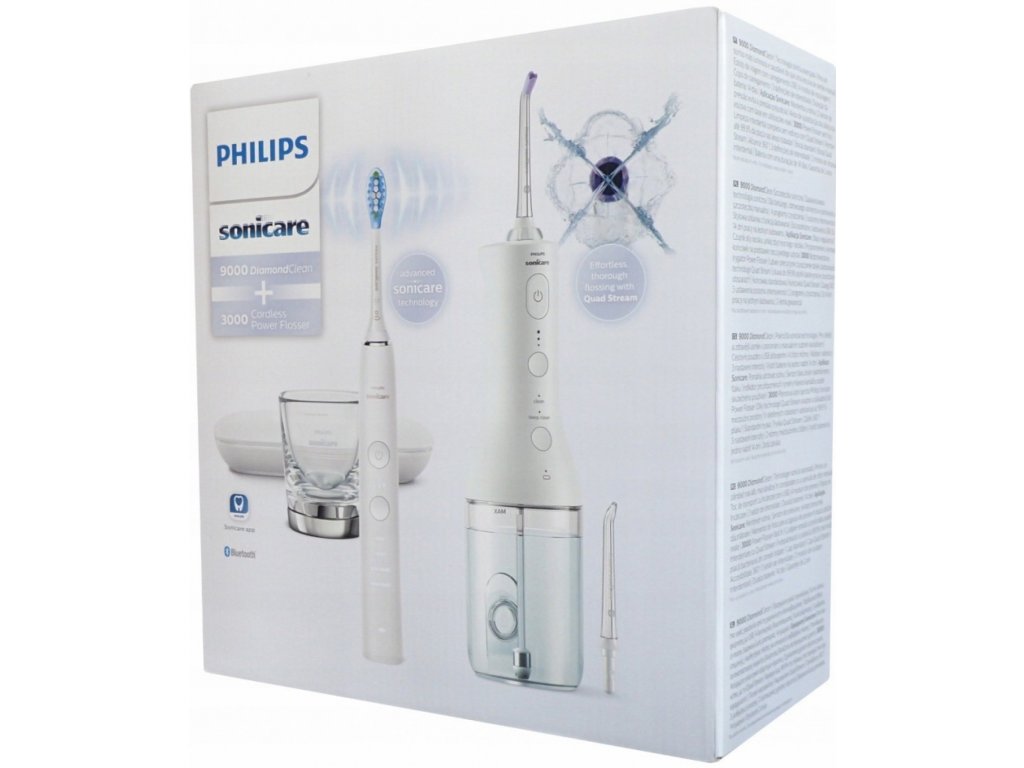 Dopřejte své ústní dutině tu nejlepší možnou péči! Kombinace sonického elektrického zubního kartáčku a výkonné ústní sprchy dokonale odstraní zbytky jídla a zubní plak z povrchu zubů i mezizubních prostor. Philips Sonicare DiamondClean nové generace je vybavený tlakovým senzorem, který vás automaticky upozorní v okamžiku, kdy zuby příliš drhnete. K lepší čisticí technice vás vede i díky propojení s chytrou mobilní aplikací, prostřednictvím které vám v reálném čase poskytuje komplexní zpětnou vazbu o čištění zubů a rady na míru. Díky technologii BrushSync přístroj rozpozná typ používané kartáčkové hlavice a automaticky pro vás vybere takový režim čištění, který se k ní nejlépe hodí. Na nutnost výměny kartáčkové hlavice vás včas upozorní zvukovým signálem a rozsvícením příslušné kontrolky. Ústní sprcha dokáže odstranit až 99,9 % plaku a nečistot z mezizubních prostor, plošek zubů a linie podél dásní.* Kompletní cyklus čištění trvá pouze asi 60–90 vteřin, a to díky jedinečné trysce směřující proud vody do tvaru písmene X. Oba přístroje disponují různými režimy čištění a třemi stupni intenzity čištění pro váš maximální komfort. Součástí balení je tělo kartáčku v bílé barvě, kartáčková hlavice navržená pro důkladné odstranění zubního plaku, elegantní nabíjecí sklenice, pevné cestovní pouzdro s USB nabíjením a přenosná ústní sprcha se dvěma tryskami.