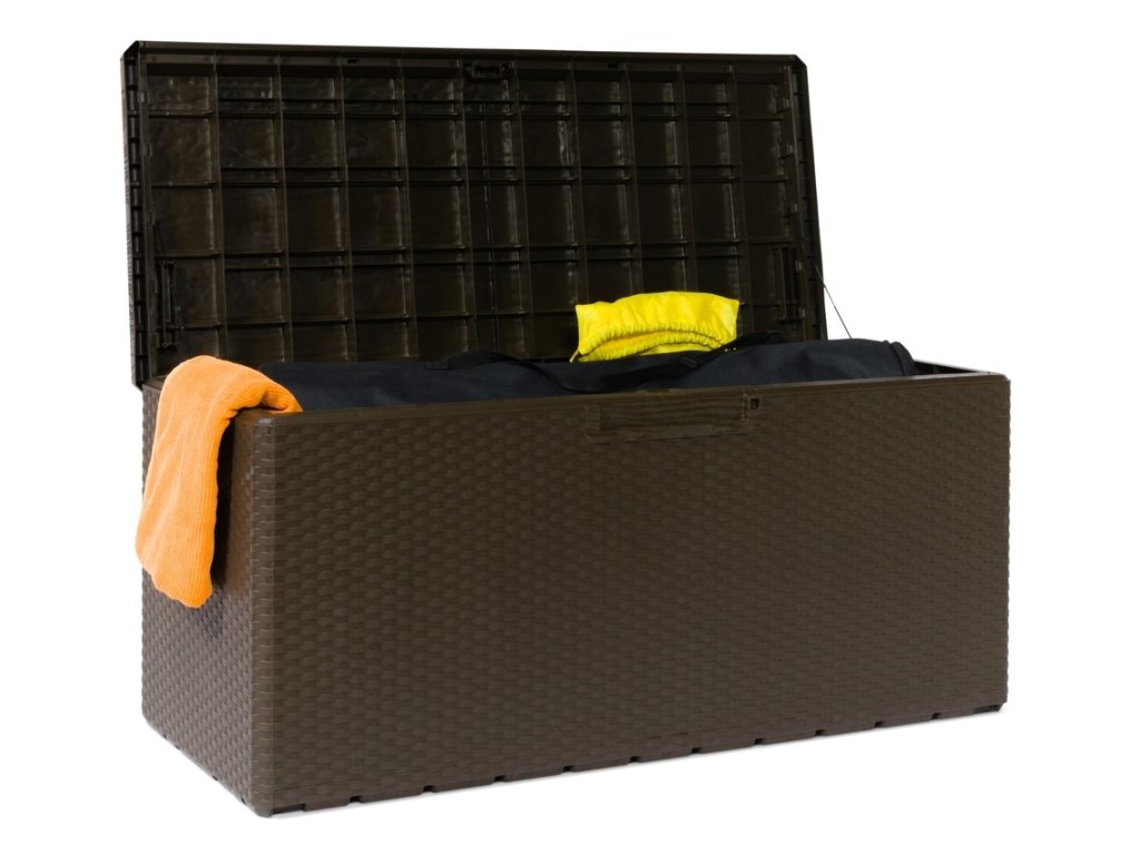 Představujeme Vám zahradní plastový úložný box PORTOFINO 340 l v elegantní hnědé barvě - ideální řešení pro Vaše zahradní úložné potřeby!