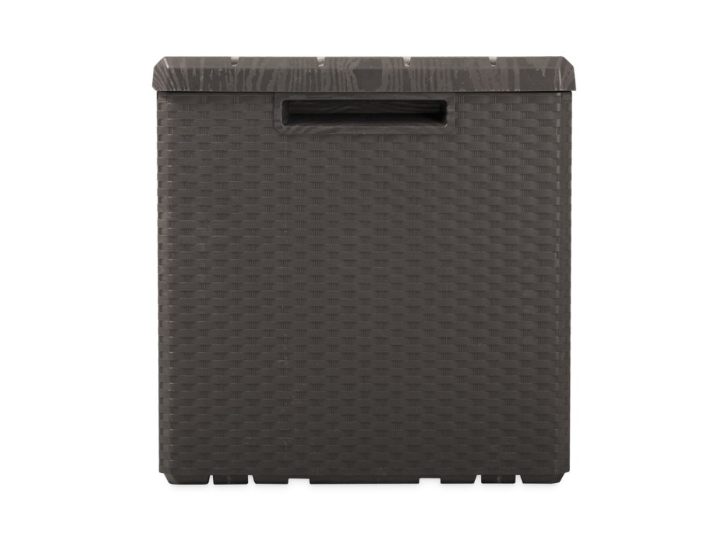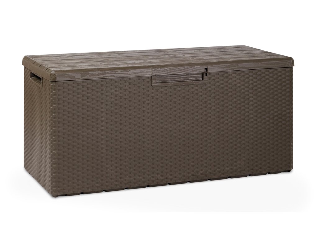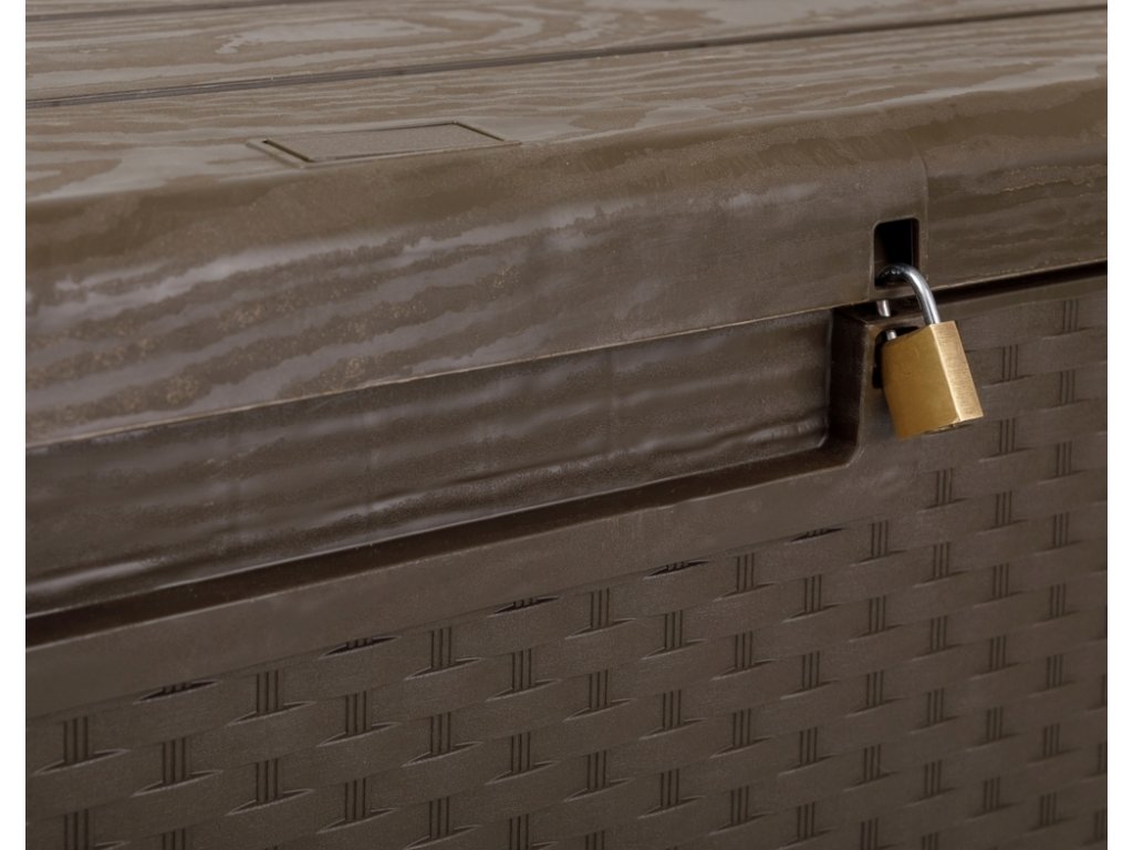 Imitace ratanového povrchu na bočních stěnách a dřevěného na víku dodává PORTOFINO 340 l luxusní vzhled, který se bude skvěle hodit k jakémukoli zahradnímu designu. Jeho hnědá barva je vkusná a neutrální, takže se dokonale sladí s okolím. Tento box má také možnost uzamčení, což zajišťuje bezpečné uložení Vašich cenností a nábytku.