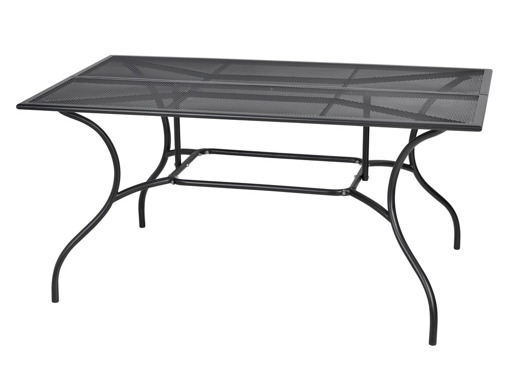 Kovový zahradní stůl s drátěnou vrchní deskou obdélníkového tvaru.