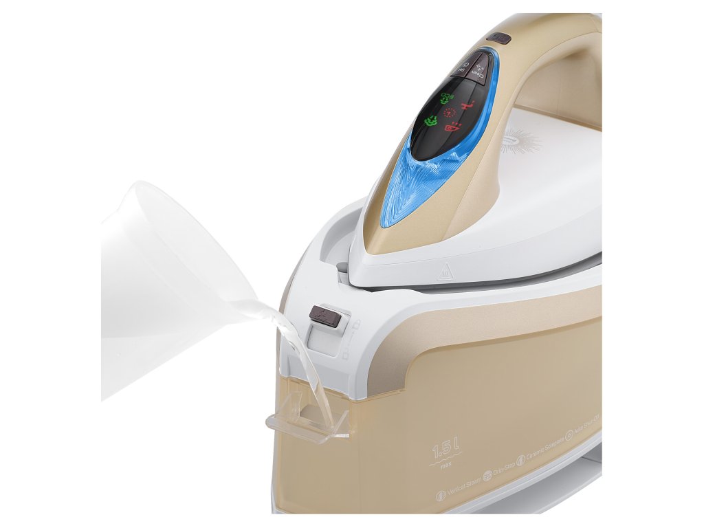 Pohodlně žehlit můžete hned ve 2 režimech. Úsporný režim ECO je určen pro běžné žehlení, režim NORMAL pak využijete pro standardní či vertikální žehlení. Zásobník na vodu o objemu 1,5 litru je po dobu žehlení umístěn v základně, a nezatěžuje tak ruční jednotku.
