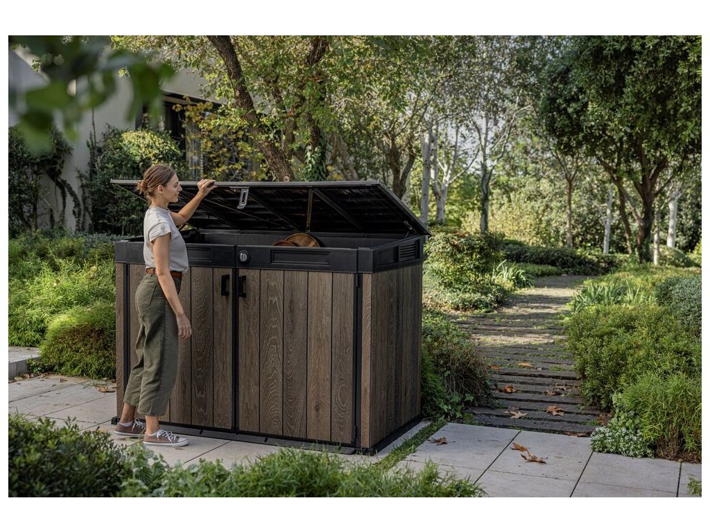 Díky objemu 2 020 l v ní lze uschovat až dvě popelnice o objemu 360 l nebo tři popelnice o objemu 240 l.