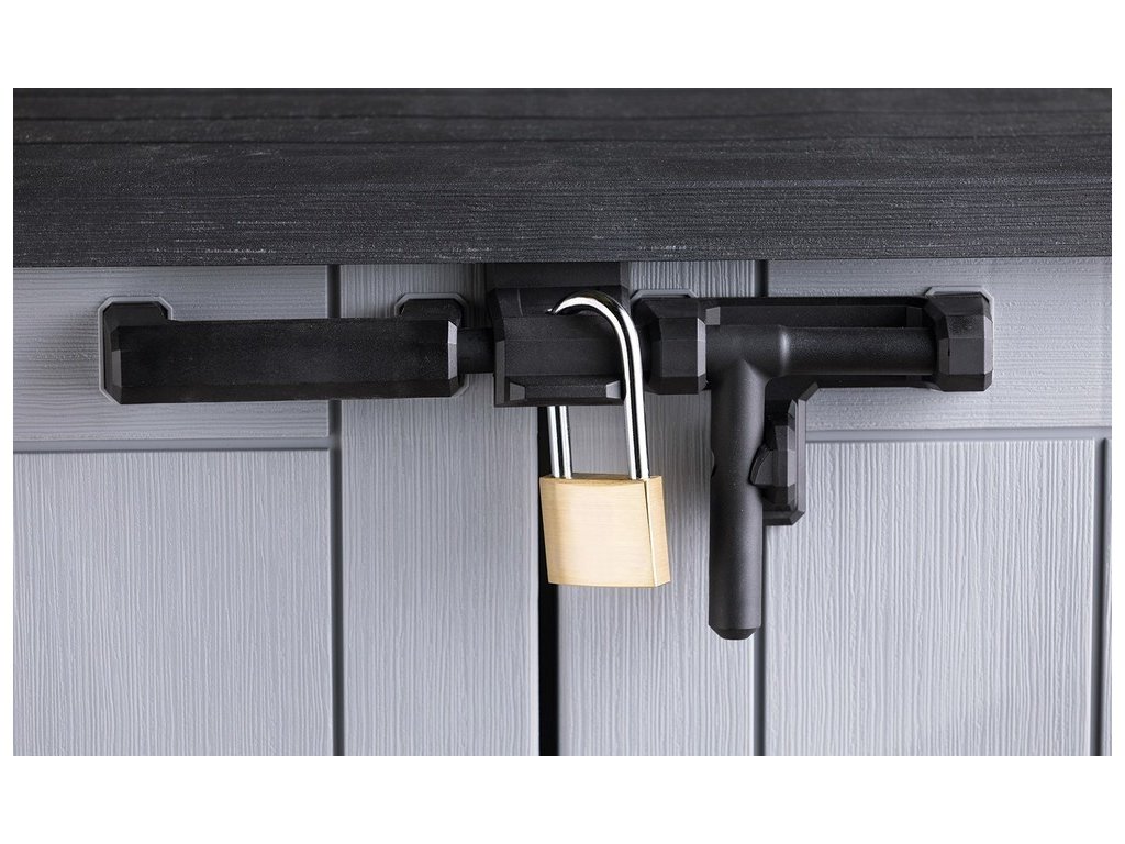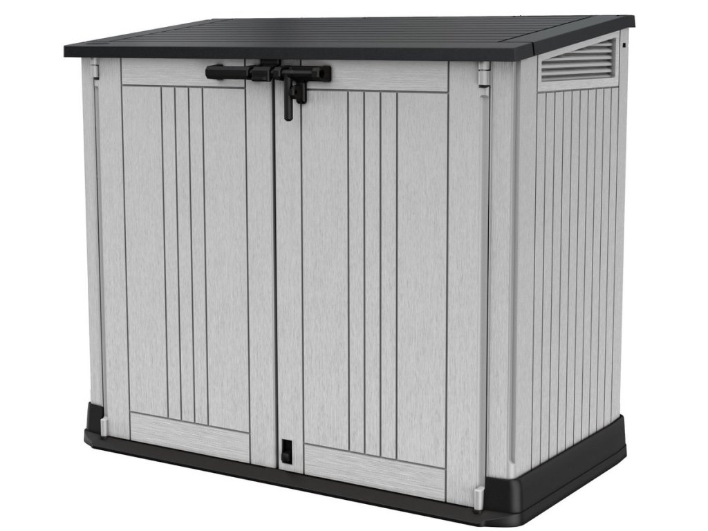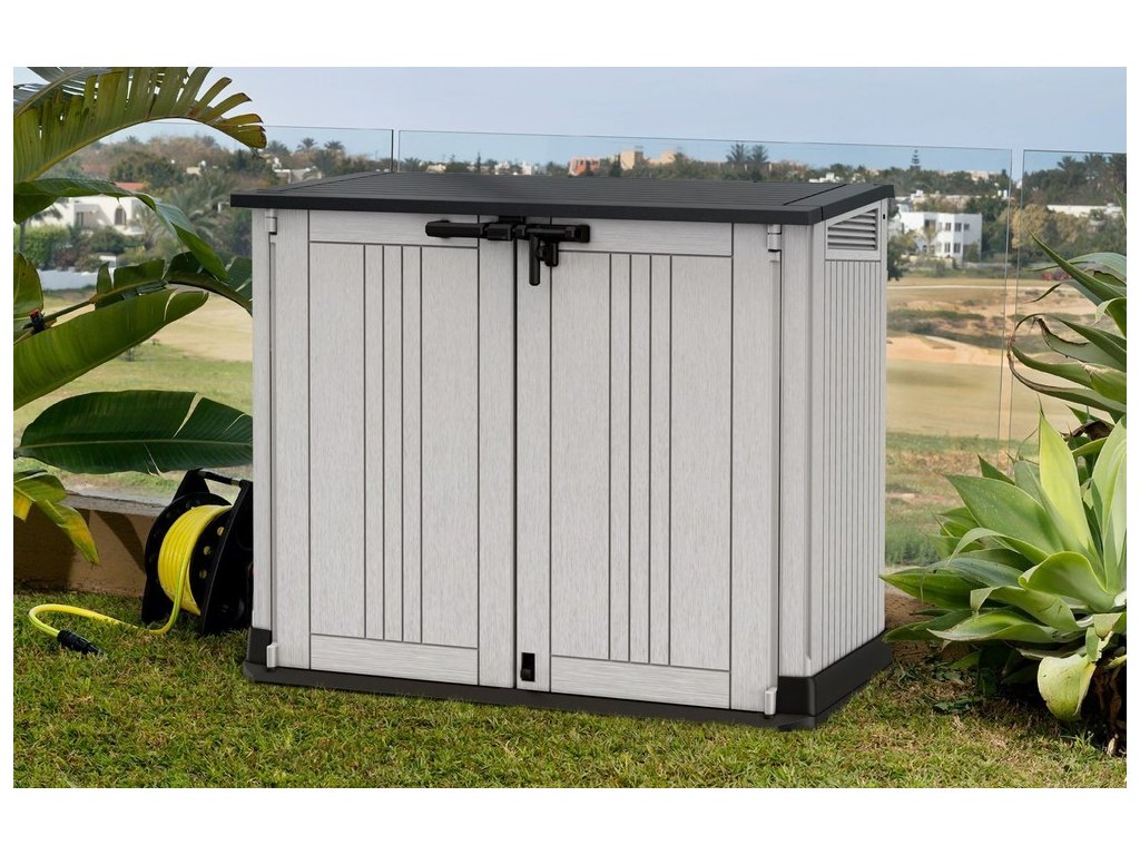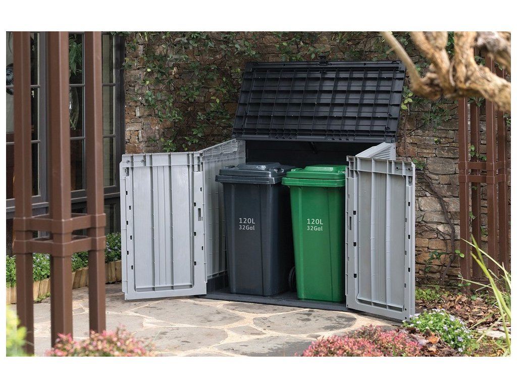Úložná skříň se hodí všude, kde je nutné uschovat zahradní doplňky, nářadí nebo např. popelnice (dvě popelnice o objemu 120l).
