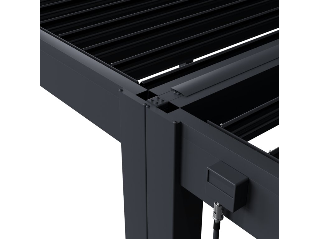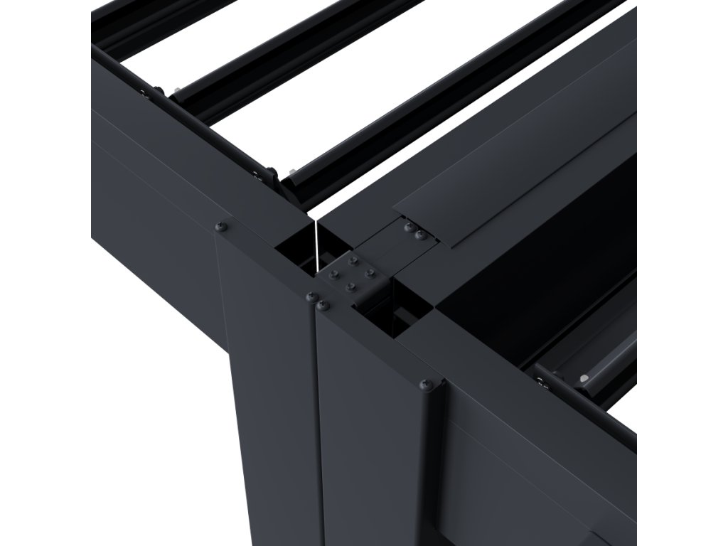 Konstrukce spojovací sady je samozřejmě ve stejné barvě jako celá pergola. Jedná se konkrétně o antracitovou barvu RAL 7016 v matné povrchové úpravě. Pergola i spojovací díl jsou vyrobeny z vysoce kvalitního hliníku, který je ošetřen práškovou barvou, což zaručuje odolnost vůči povětrnostním vlivům.