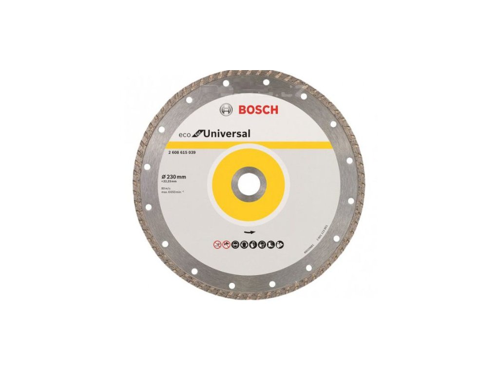 - Diamantové kotouče řady BOSCH Eco for Universal TURBO jsou ideální pro většinu běžných stavebních materiálů jako je beton, cihly, vápenopískové cihly v méně náročných podmínkách.