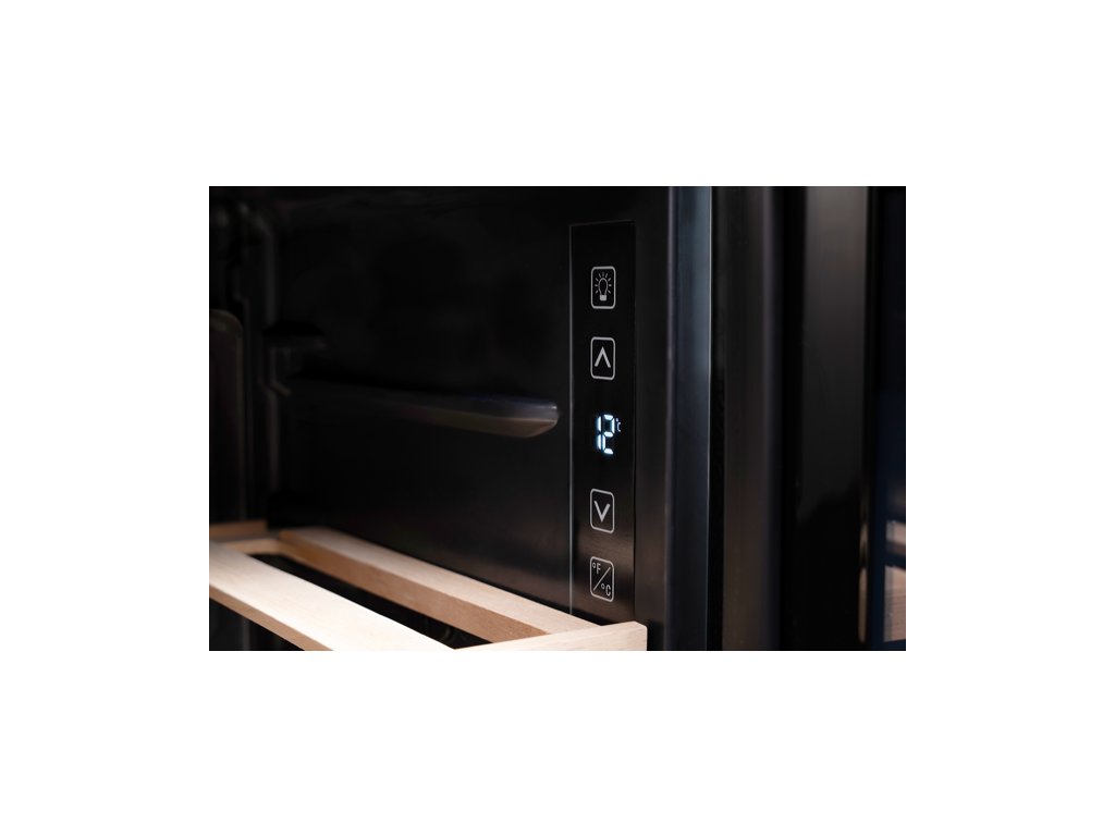 Vinotéka CW-094S30 GB má jednu teplotní zónu, kterou lze nastavit pomocí digitálních ovladačů v rozsahu od 5°C do 20°C. Chladnička má LED vysoce účinné osvětlení a 3 výsuvné dřevěné police, které usnadňují ukládání a vyjímání lahví.