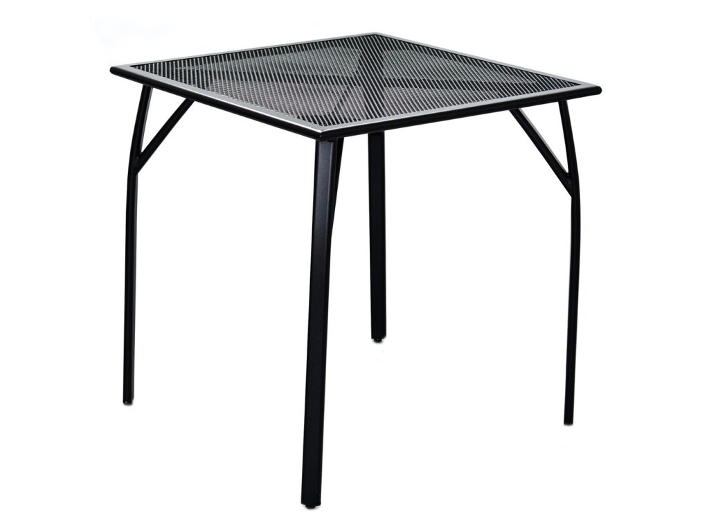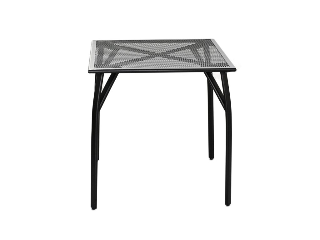 Kovový zahradní stůl s drátěnou vrchní deskou čtvercového tvaru.